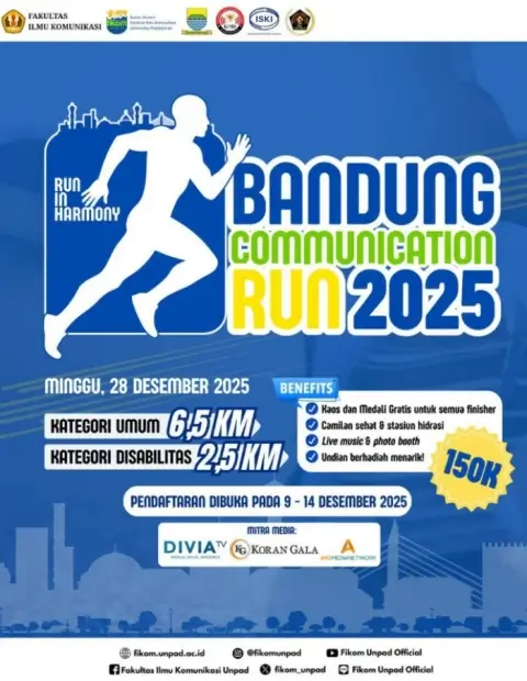 Bandung (SUKABUMINEWS.NET) – Fakultas Ilmu Komunikasi Universitas Padjadjaran (Fikom Unpad) berkolaborasi dengan Ikatan Alumni (IKA) Fikom Unpad menyelenggarakan Bandung Communication Run (BCR) 2025 dengan mengusung tema "Run in Harmony". Ajang olahraga rekreatif ini akan digelar pada Ahad, 28 Desember 2025 mulai pukul 05.30 WIB berlokasi di Balai Kota Bandung.