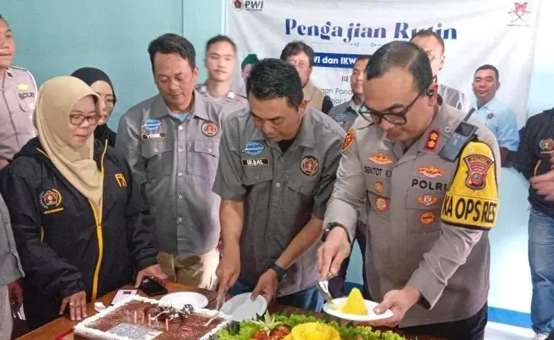 | Ketua PWI Kota Sukabumi, Ikbal Zaelani Saptari dan Kapolres Sukabumi Kota AKBP Sentot Kunto Wibowo saling memotong kue dan tumpeng di momen HPN 2026. (Dok. Ist) |